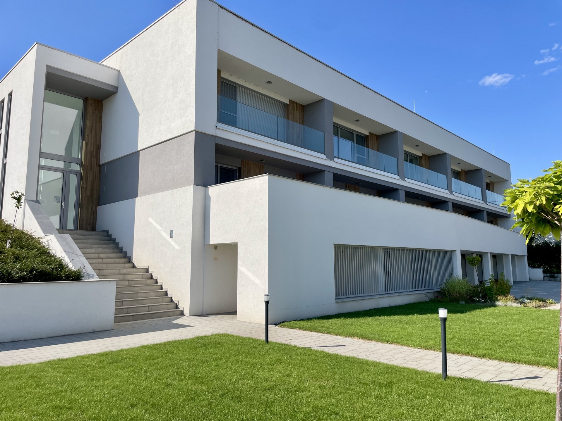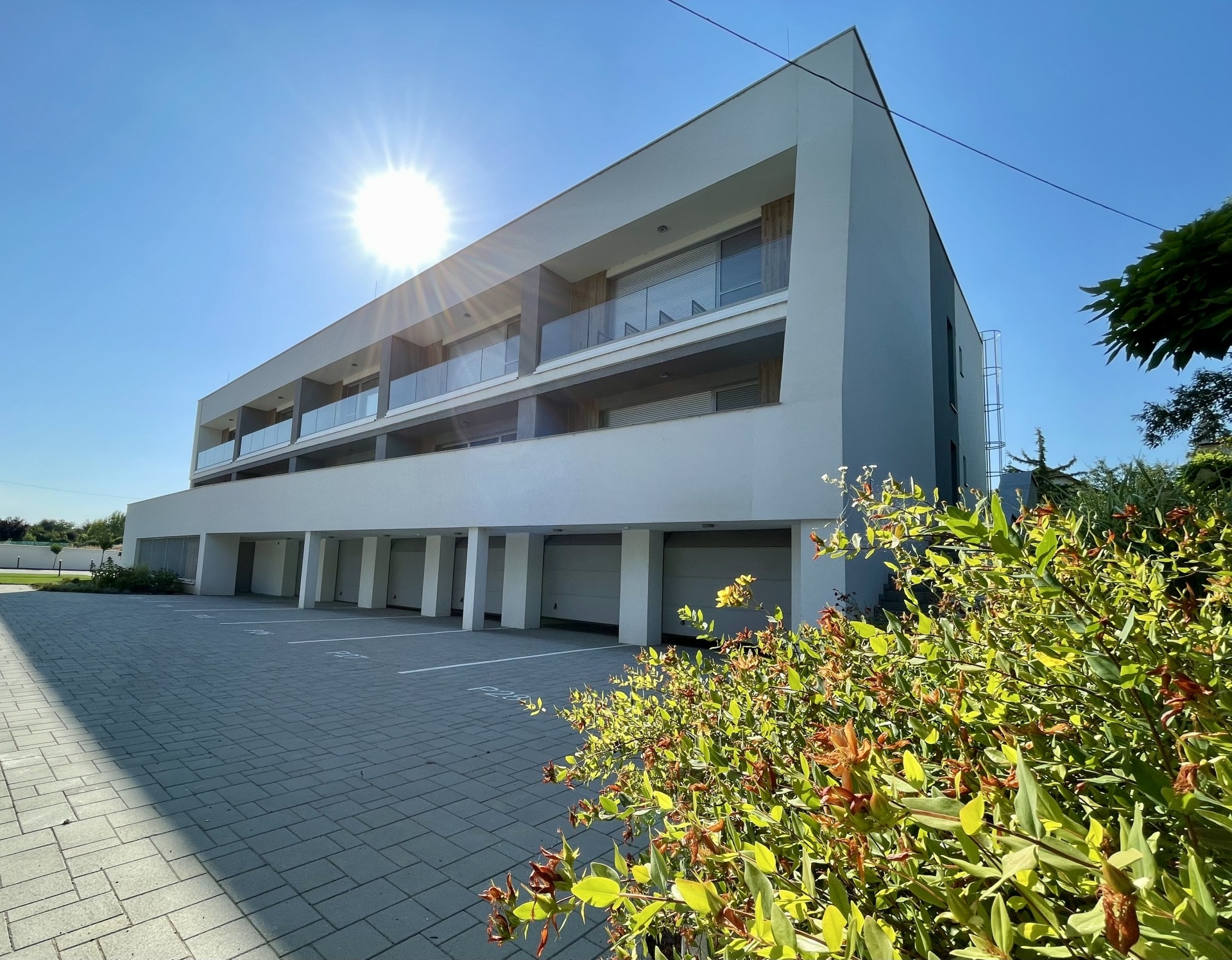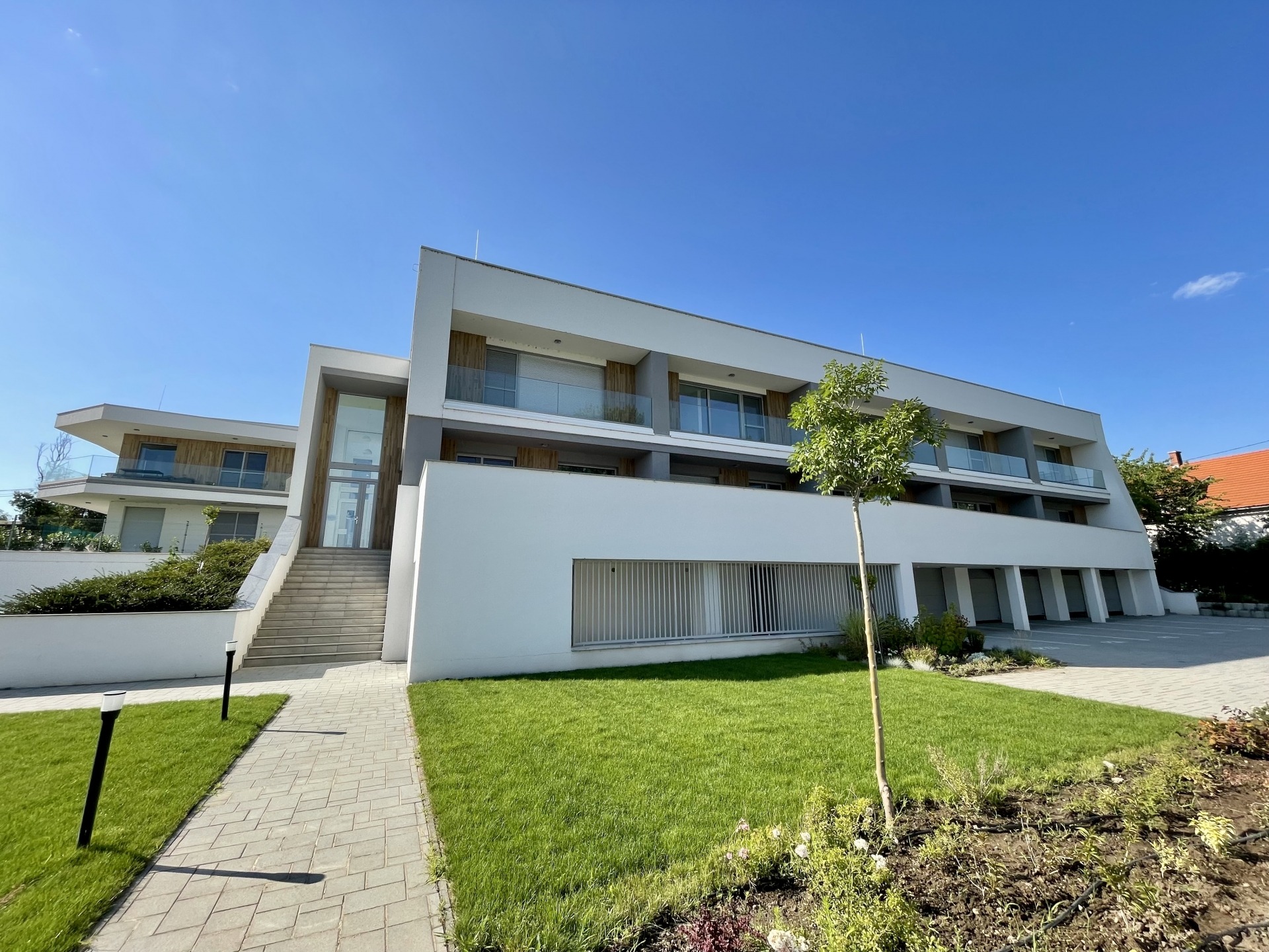 A projekt lapos tetős épületei háromszintesek, az alagsori területeken tároló helyiségek és 6 db garázs kapott helyet. Minden lakás rendelkezik terasszal vagy erkéllyel.