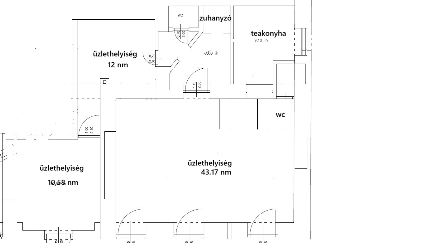 A bérbeadó ingatlan helyiségei: 43,17 nm, 10,58 nm és 12 nm területű üzlethelyiségek, 9,1 nm teakonyha, két Wc külön helyiségben, zuhanyzó, tároló.